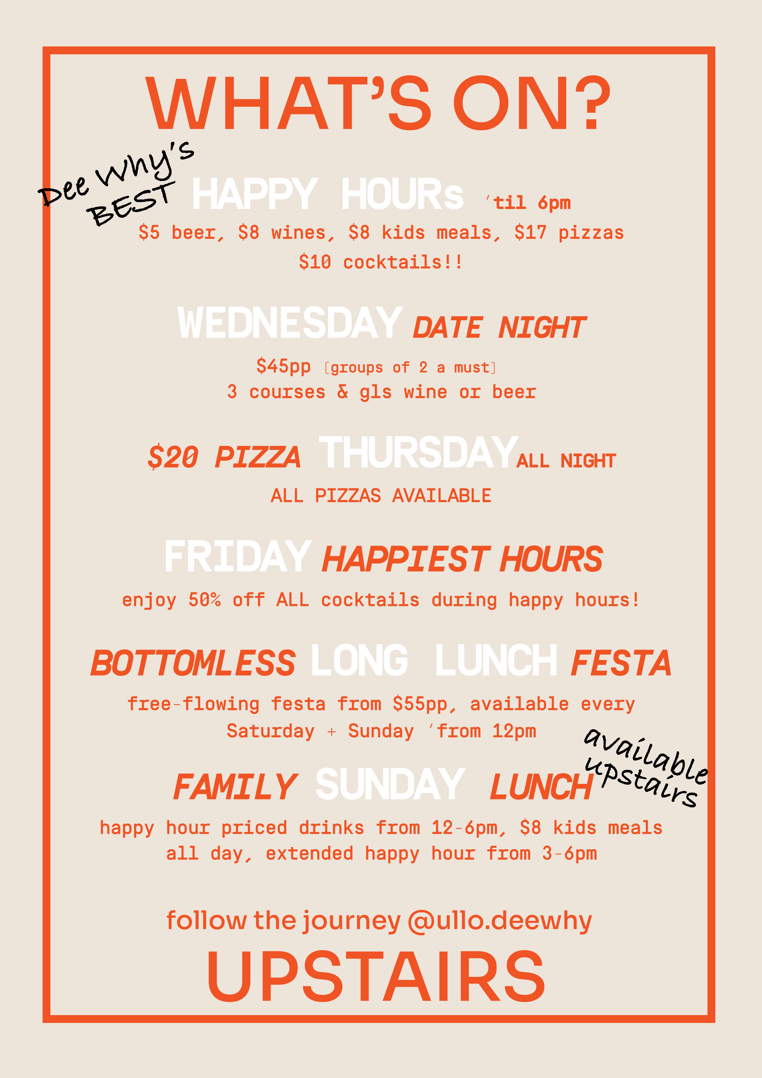 Menu for Ocean View Hours with drink and food options, including beers, wines, cocktails, kids meals, and pizza, set against a black and white abstract patterned background.